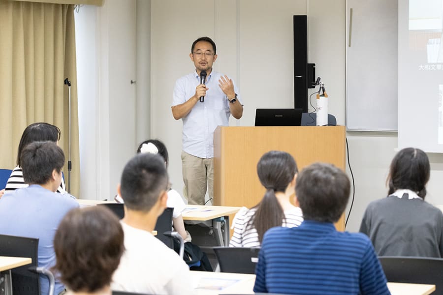2024年8月1日(木)に奈良県立奈良高等学校の生徒さん15名、引率の先生1名、OBOGの方3名が、校外活動の一環として本研究所に来所しました。当日は塚本先生による講義と図書室内の書庫見学を行いました。