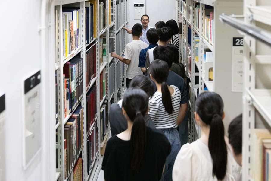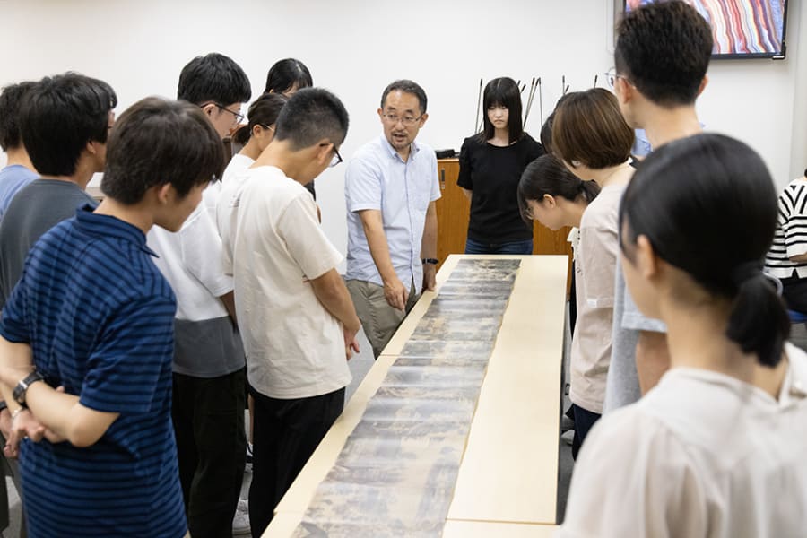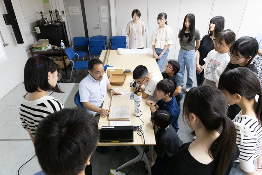 講義では、塚本先生のこれまでの経験や大学での研究内容の紹介が行われ、その後図書室内の書庫見学が、各階ごとに行われました。会議室に戻った後は、先生が研究室や図書室からお持ちになった資料をもとに説明され、生徒さん達は巻物の複製や書籍に実際に触れてみる体験をされました。