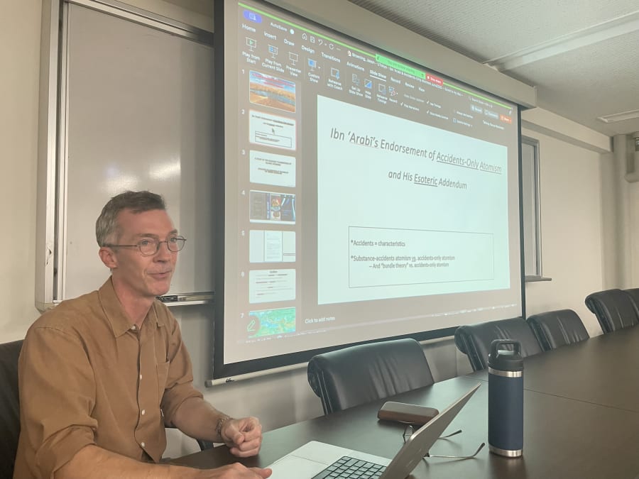 ジェイソン・ブラウニング氏は2024年9月から東洋文化研究所に訪問研究員として所属しており、インディアナ大学中央ユーラシア学部に提出すべく、仏教哲学からイスラーム思想への原子論を舞台とする影響関係をテーマとする学位請求論文の作成に勤しんでいる。今回のセミナーでの発表は学位請求論文で扱う内容のイスラーム圏における後史を、イブン・アラビーという注目度の高い巨人を素材として論じるものであった。雄大なスケールの明晰な発表であったが、まさにそれゆえに、論証の細部に深入りすることはなかった(聴衆のレベルに合わせた調整だったのかもしれない)。そのため、質疑では、大きなストーリーを構成するいくつかの重要な局面について、解釈の資料的な根拠などを問う質問が目立った。会は、ブラウニング氏が大きな潜在性を秘めた一連の研究を完成させ、「正しければ巨大な業績だ!」という聴衆の反応をよりシンプルな「巨大な業績だ!!」に転換させる日の近からんことを祈りつつ終わった。会場9名、オンライン11名の参加者があった。