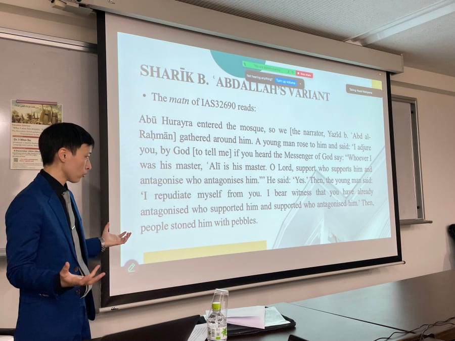 2024年12 月4日、國立政治大学(台北)のI-Wen Su教授を講師として、東文研セミナー“ ‘Who I was his master, ʿAlī is his master’: The Narrative Development of a Shīʿī Hadith and Its Transmitters in the Eighth Century”が開催された。Su氏の講演は、「私を主人とする者にとっては、アリーが主人である」という趣旨の発言を預言者ムハンマドに帰す伝承群を伝承経路と本文の双方に見られるヴァリエーションに即して検討するものであった。7~8世紀のクーファに当該伝承群の広範な流布の出発点を見いだしたSu氏は、ウマイヤ朝の政治的主張に対抗してアリーを称揚しようとするクーファの地域主義が初期的な流布の背景にあったとする解釈を提示した。質疑では、Su氏がそのような地域主義をシーア派とは異なるものと規定したのに対する疑問が提出されるなど、講演内容がさらに深められた。本セミナーには対面で約10名、オンラインで30名ほどが参加した。