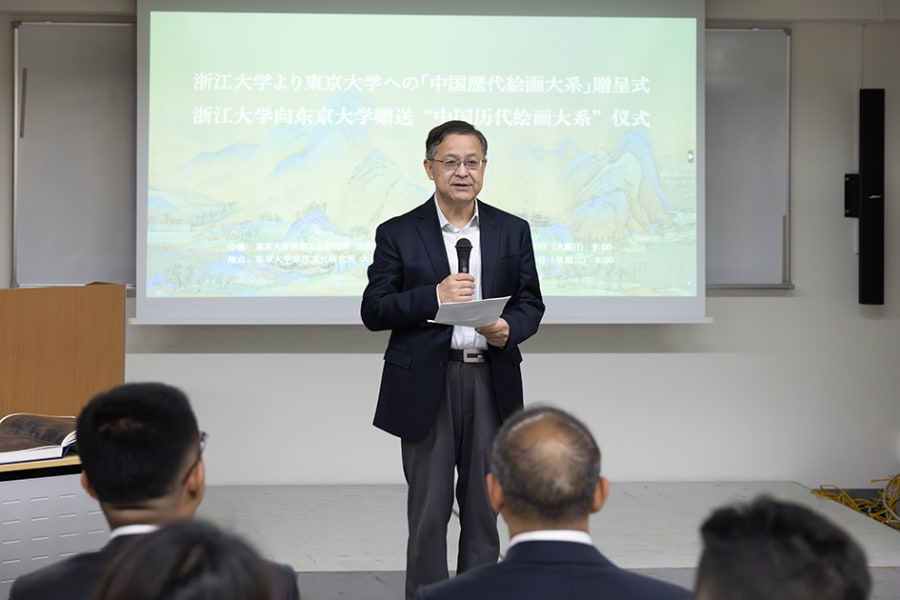 贈呈式では、繆哲教授(浙江大学)の司会のもと紹介ビデオを視聴した後、中島所長よりお礼の言葉と、将来の人材がこの大型叢書を繙くことで中国絵画への新しい眼を養うことができる期待とが述べられ、また金曉明教授(浙江大学中国古代書画研究中心副主任)より、東洋文化研究所が五十年にわたり編集を続けてきた『中国絵画総合図録』と補完し合いながら、今後も新しい学術研究のプラットホームを形成していくことの重要性が述べられました。