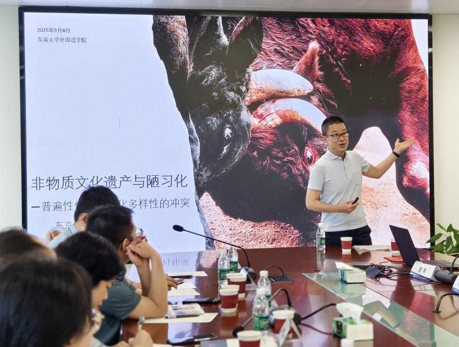 2025年9月4~5日に、中国・東南大学外国語学院で開催された東南大学海外中国史料研究中心主催国際フォーラム「“東亜文化遺産與記憶”円卓論壇・東南大学全球名師講堂」において、菅豊教授による「非物質文化遺産與陋習化―普遍性価値與文化多様性的冲突(無形文化遺産と因習化―普遍的価値と文化多様性の相克)」と題する招待講演が行われました。その後、東京大学東洋文化研究所班研究「東アジアの文化遺産と記憶 / Cultural Heritage and Memory in East Asia 」メンバーを含む、日中の研究者たちによって活発な議論が行われました