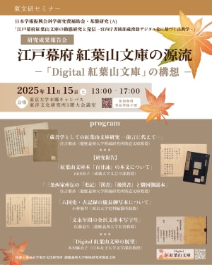 本セミナーは日本学術振興会科学研究費補助金 基盤研究(A)「江戸幕府紅葉山文庫の動態研究と発信―宮内庁書陵部蔵漢籍デジタル化に基づく古典学―」の研究成果報告会を兼ねるものです。ふるってご参加下さい。