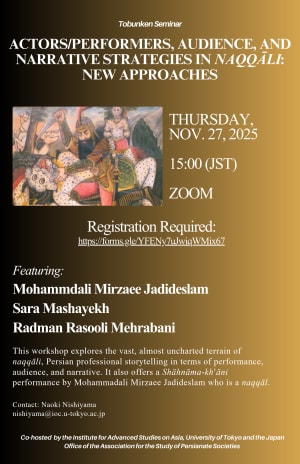 The Institute for Advanced Studies on Asia, University of Tokyo, and the Japan Office of the Association for the Study of Persianate Societies are pleased to co-host Tobunken Symposium: “Actors/Performers, Audience, and Narrative Strategies in Naqqāli: New Approaches,” an online workshop on naqqāli that gathers together three papers by young naqqāli scholars across the globe. This workshop explores the vast, almost uncharted terrain of naqqāli, Persian professional storytelling in terms of performance, audience, and narrative. It also offers a Shāhnāma-khvāni performance by Mohammadali Mirzaee Jadideslam who is a naqqāl.